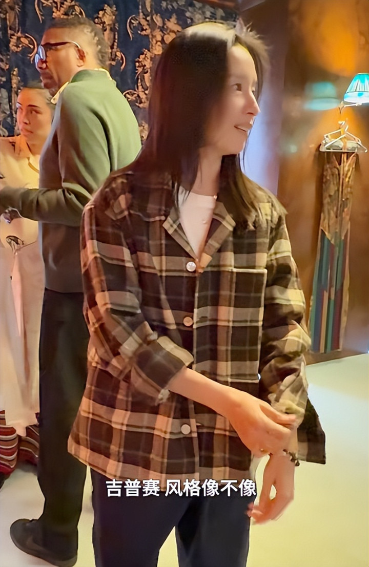 在此期间,董洁还尝试了一件浅色花格衬衫,直接化身成了“农村大娘。”